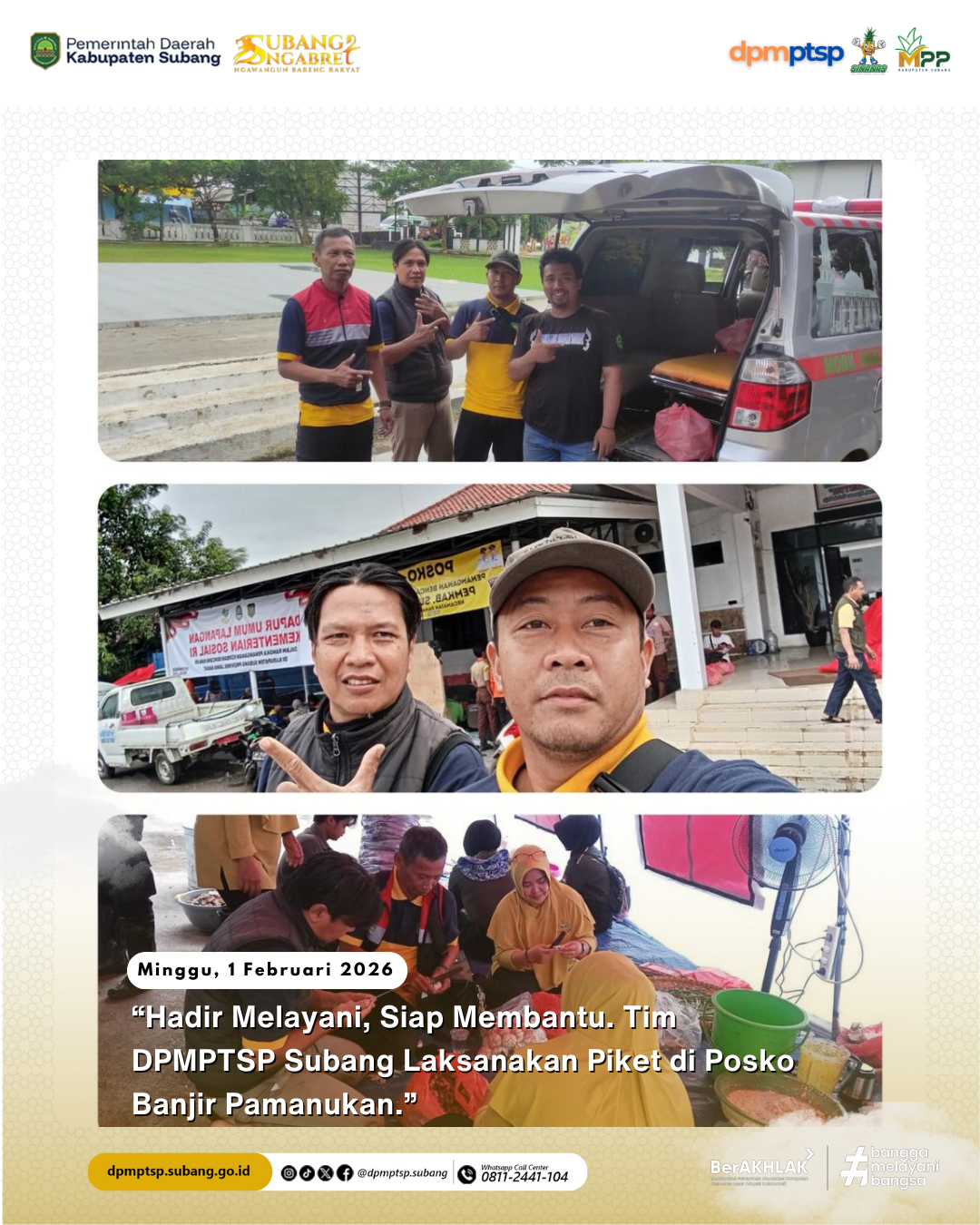 01/02/2026 dalam Semua Bidang 0 Hadir Melayani dan Siap Membantu, Tim DPMPTSP Subang Laksanakan Piket di Posko Banjir Pamanukan. Selengkapnya